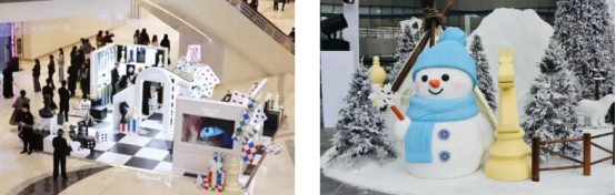 商場內(nèi),蘇州中心商場聯(lián)合品牌搭建的暖冬氛圍打卡裝置,以紙牌和棋局為元素,啟幕節(jié)日雅趣。同時打造雪景主題場景,設(shè)置雪山、雪松、雪人及小木屋“冰天雪地”打卡區(qū),營造沉浸式冬日氛圍。