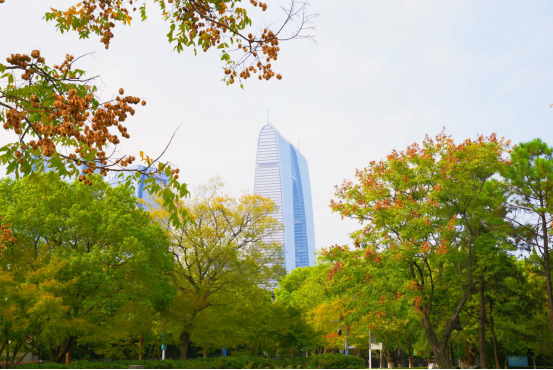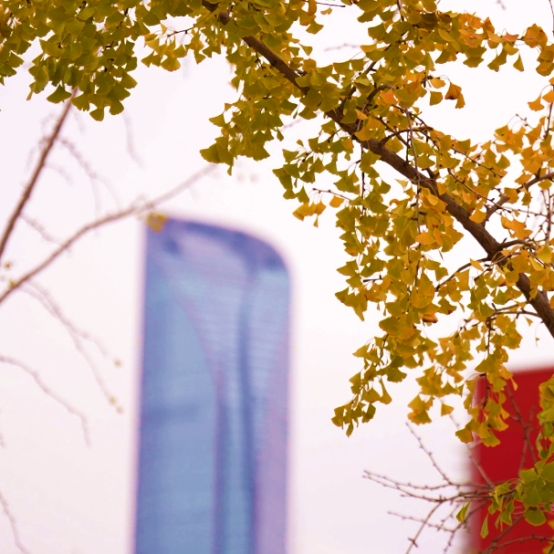 盡日苔階閑不掃,滿園銀杏落秋風。銀杏則是秋日里期待的另一抹亮色,待一簇簇金黃扇葉綴滿枝頭,自然勾勒出天然畫框,恰好將遠處的城市地標框進這幅秋景圖中。