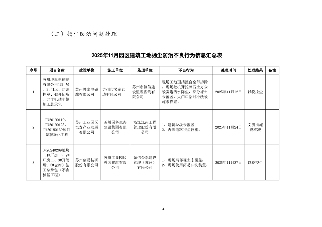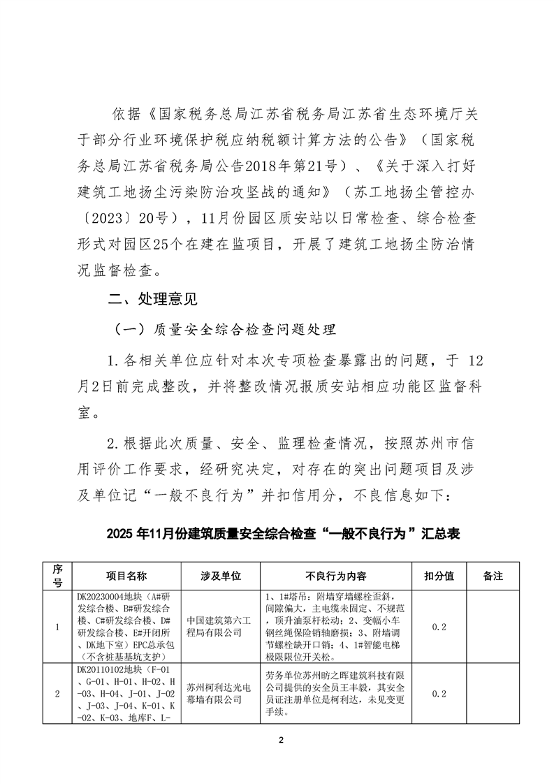 園區質安站關于11月份建筑質量安全綜合檢查、揚塵防治不良信息的通報