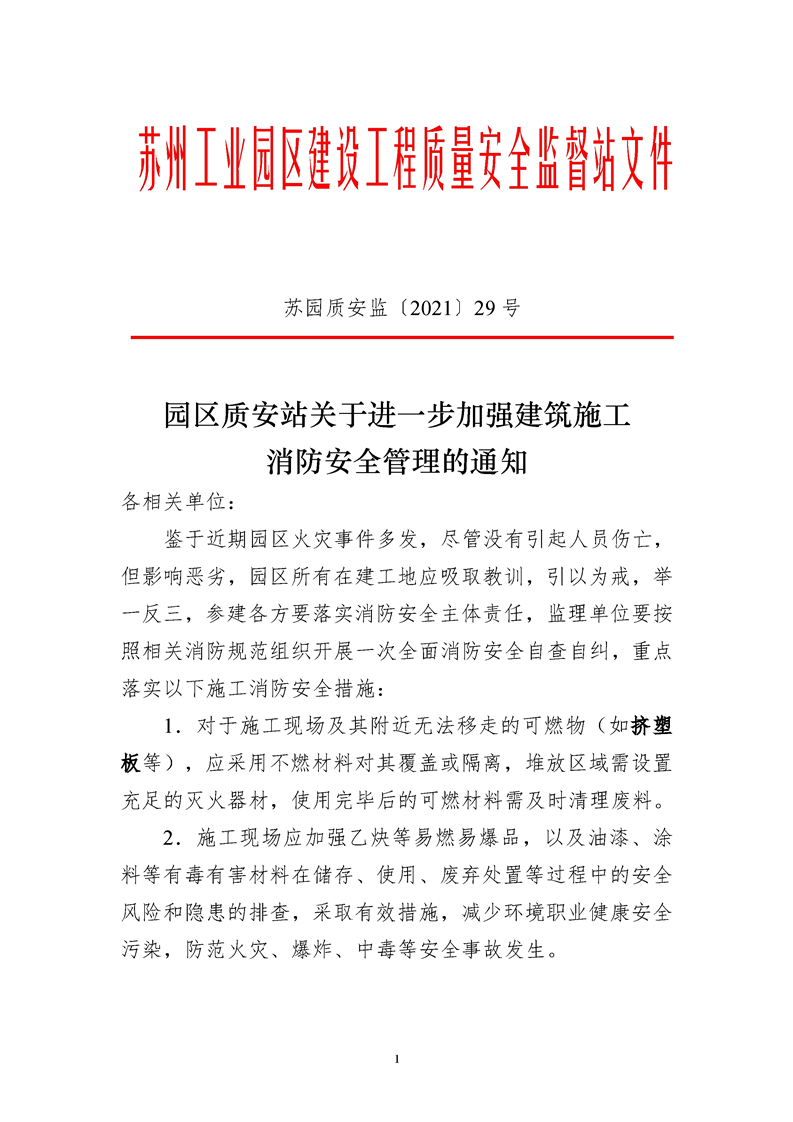 園區(qū)質(zhì)安站關(guān)于進(jìn)一步加強(qiáng)建筑施工消防安全管理的通知