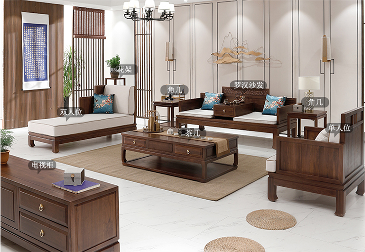 產品風格: 新中式產品型號: SF--011產品主材: 北方落梁老榆木/北美進口黑胡桃木產品尺寸: 羅漢床:210x80x92cm,貴妃位:180x80x96cm,單人位:80x80x96cm,茶幾:140x80x45cm,角幾:50x50x60cm,花幾:35x35x110cm
