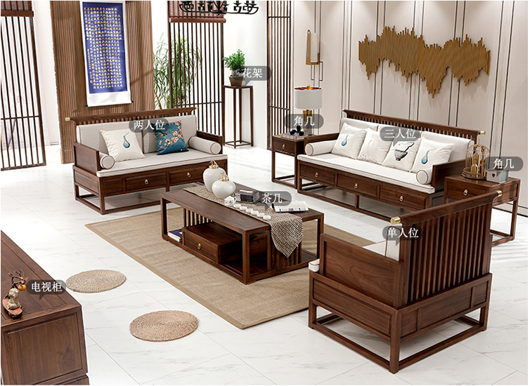 產品風格: 新中式產品型號: SF-016產品主材: 北方落梁老榆木/北美進口黑胡桃木產品尺寸: 3人位:200x80x96cm,2人位:160x80x96cm,單人位:100x80x96cm,角幾:50x50x60cm,茶幾:140x80x45cm電視柜:200x42x56cm