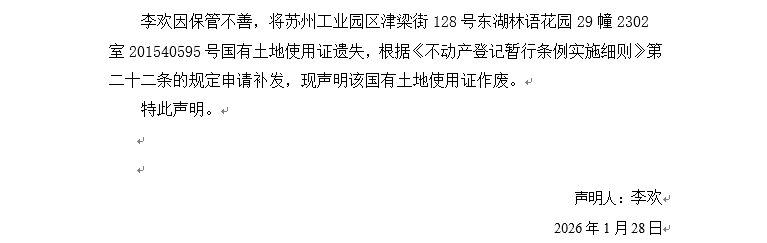 關于蘇州工業園區津梁街128號東湖林語花園29幢2302室201540595號國有土地使用證遺失聲明