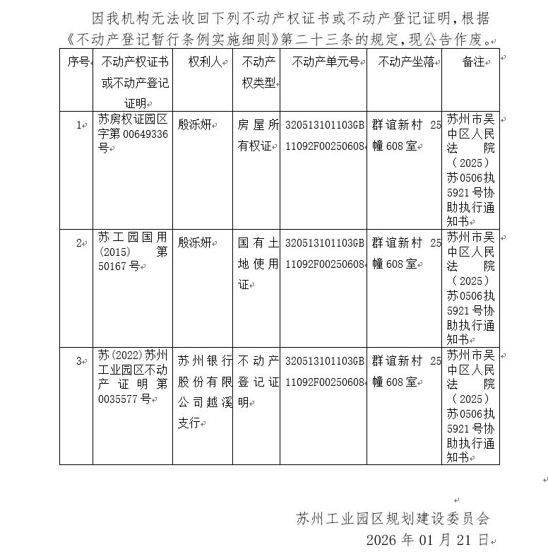 不動產權證書/登記證明作廢公告蘇園 證廢字2026(0018)號(群誼新村25幢608室)