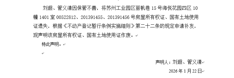 關于蘇州工業園區麗帆巷15號海悅花園四區10幢1401室00522812、201391455、201391456號房屋所有權證、國有土地使用證遺失聲明