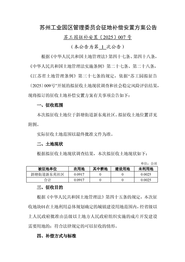 蘇州工業園區管理委員會征地補償安置方案公告(蘇工園征補安置〔2025〕007號)