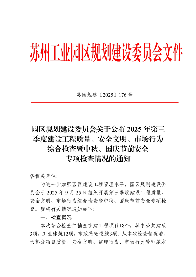 園區(qū)規(guī)劃建設委員會關于公布2025年第三季度建設工程質量、安全文明、市場行為綜合檢查暨中秋、國慶節(jié)前安全專項檢查情況的通知