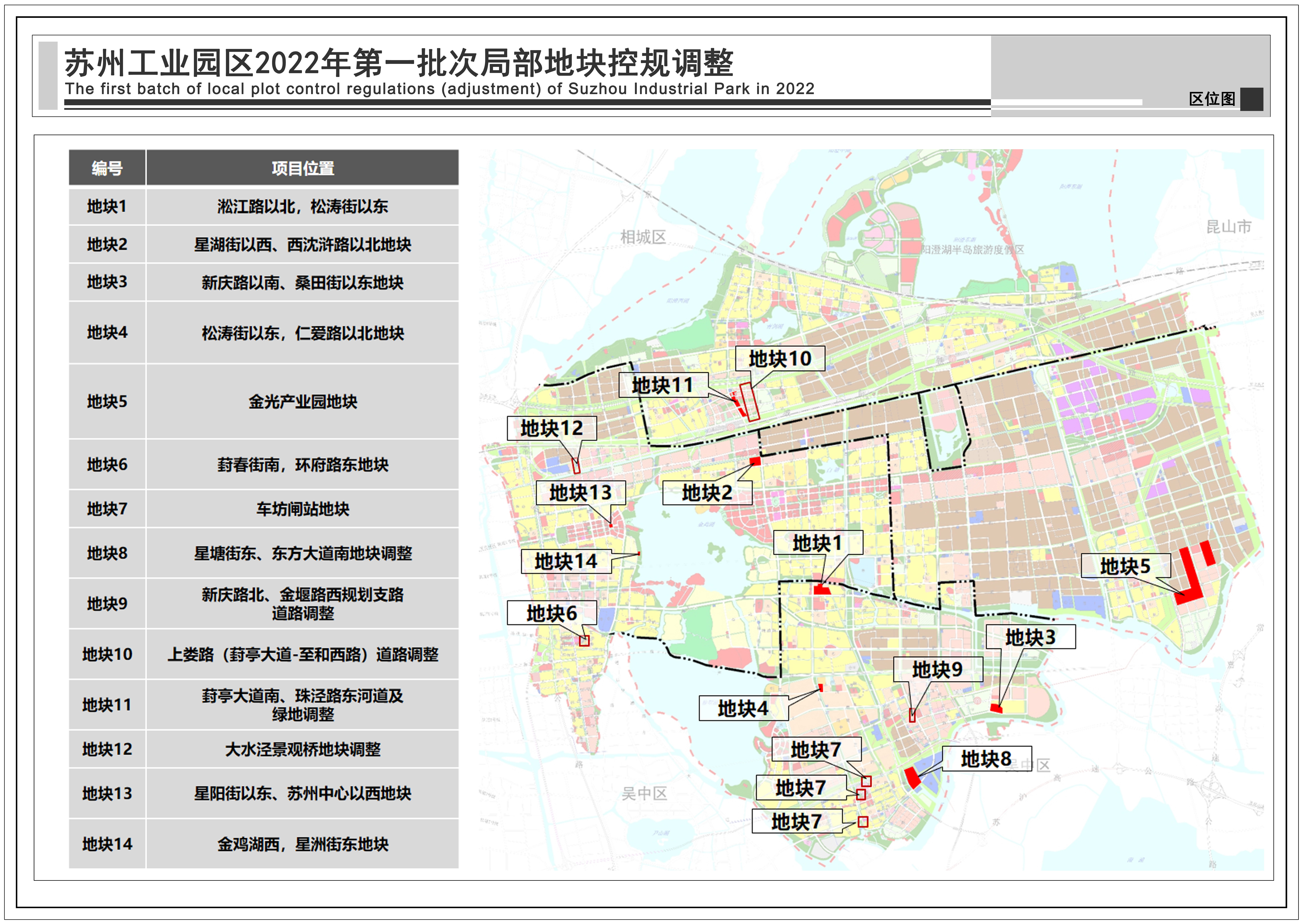 蘇州工業園區2022年第一批次局部地塊控規調整:共包括14個地塊,總用地面積1.08平方公里,詳見附圖區位圖。