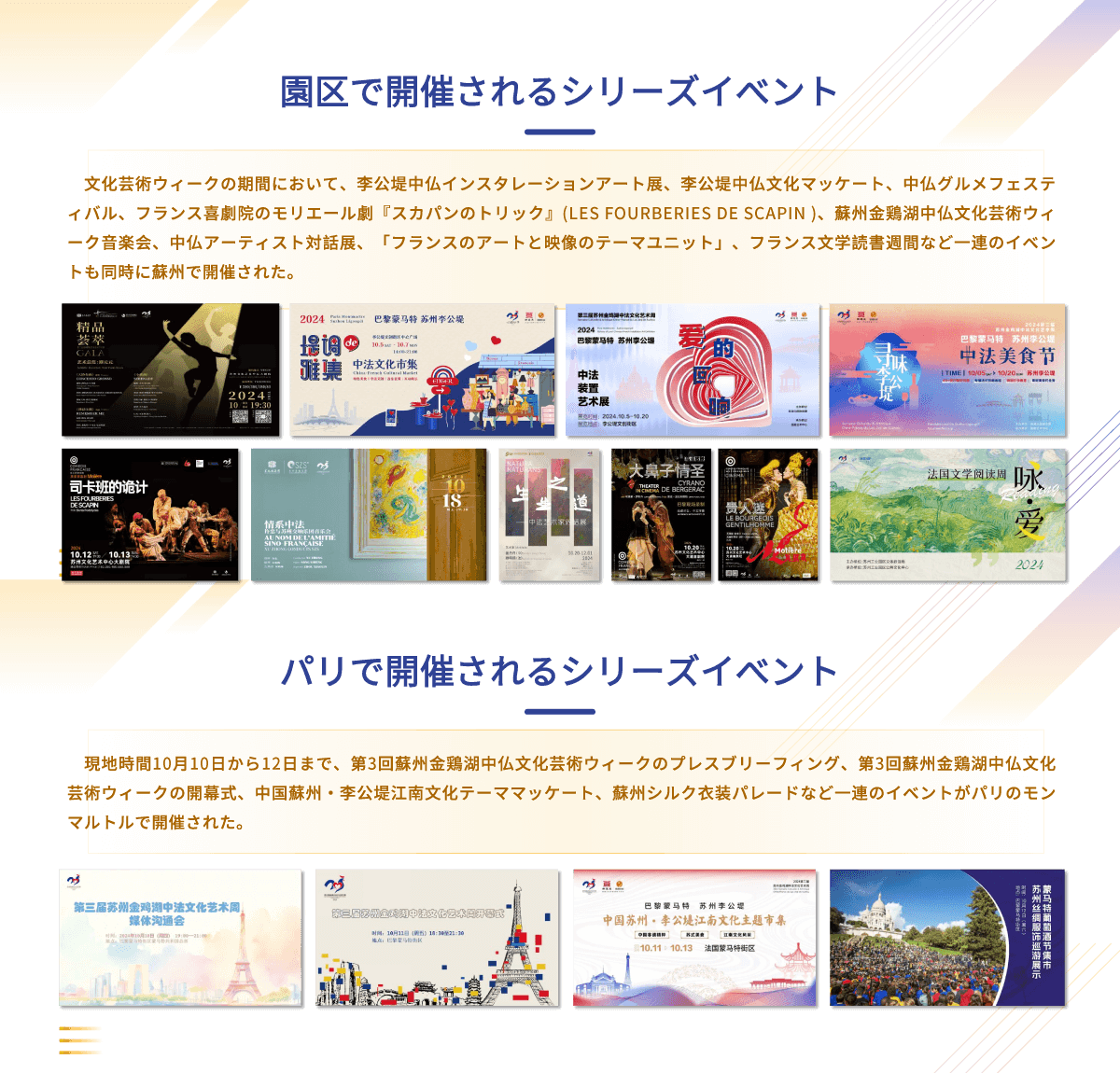 現地時間10月11日の夜、2024第3回蘇州金鶏湖中仏文化蕓術ウィークはパリのモンマルトルで幕を開けた。パリ第18區政府、パリコンベンション観光局、パリの大學、博物館、銀行、投資ファンド、文化観光企業からの100人以上のゲストが一堂に集まり、交流と協力について共に検討した。 イベントでは、園區文化體育観光局の責任者は蘇州及び蘇州工業園區の地理的優位性、文化的背景、産業クラスター、投資環境、政府サービスなどについて詳しいプロモーションを行った。 會場では、パリ第18區政府、パリコンベンション観光局、仏中協力交流協會、モンマルトル商會、テイラーアーティスト基金會の代表が次々と発言した。また、現場では昆曲のパフォーマンスと蘇州工業園の寫真展も行われた。 今回の蘇州金鶏湖中仏文化蕓術ウィークは10月5日から10月20日までパリと蘇州の両地で同時に開催され、合計13回... [MORE]