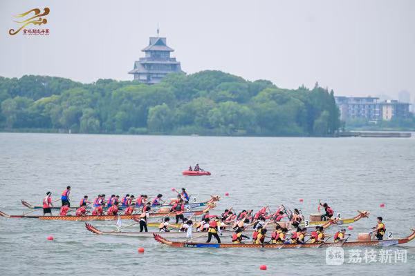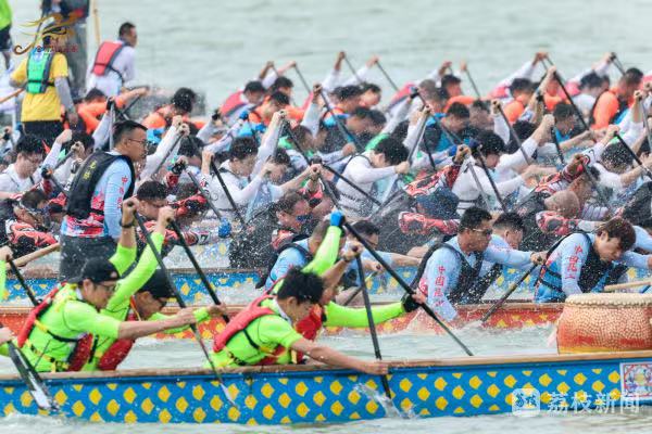 金雞湖上,一艘艘龍舟上演百龍爭渡,龍舟隊(duì)員們齊心協(xié)力、揮槳如飛,向著終點(diǎn)全力沖刺。現(xiàn)場,既有專業(yè)隊(duì)伍的速度與激情,也有國際友人解鎖“龍舟新姿勢”,彰顯著“龍舟精神”的多元魅力。如今,金雞湖端午龍舟賽已經(jīng)成為蘇州的新民俗,吸引了眾多的市民和游客前來觀賽,為自己喜愛的隊(duì)伍加油助威。