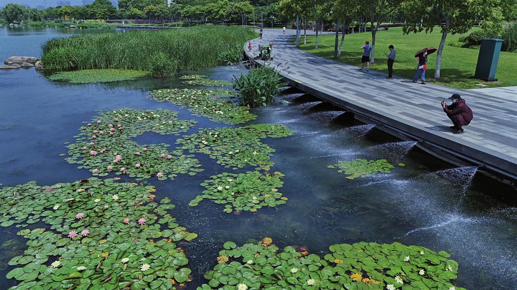 昨天,環(huán)金雞湖步道新安裝的凈水系統(tǒng)啟用,一排噴頭不斷向湖面噴射清水,使湖水快速流動(dòng),有效防止藍(lán)藻滋生。清澈的湖面上睡蓮盛放,引來(lái)行人駐足觀賞。