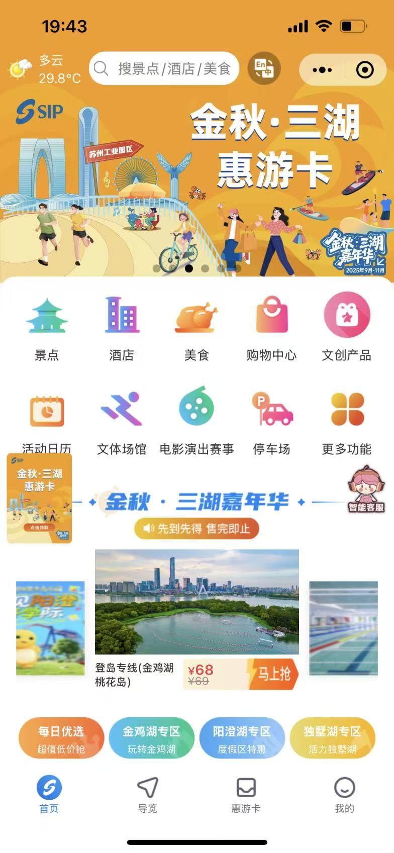 為進一步提升市民游客的幸福感。嘉年華期間,園區(qū)發(fā)布《金秋?三湖嘉年華指南》,集中呈現(xiàn)活動日程、推薦玩法、消費地圖等實用信息,為市民游客暢享園區(qū)金秋文旅盛宴提供全方位指引。“金秋·三湖惠游卡”和“金秋·三湖嘉年華消費券”,則匯聚千余家商戶實實在在的優(yōu)惠,以及50余場演出、近20場體育賽事和40余場展覽展會,覆蓋餐飲、住宿、文旅、會展、汽車等重點消費領(lǐng)域。游客可以通過“惠游園區(qū)”公眾號、“數(shù)字金雞湖”、“同程旅行”小程序等平臺,領(lǐng)取專屬折扣與滿減禮遇,將出行、住宿、消費一手掌握。此外,憑借演藝賽事門票,還能兌換通用消費券及商家專屬禮包,延伸文旅體驗,盡享“票根+”福利。