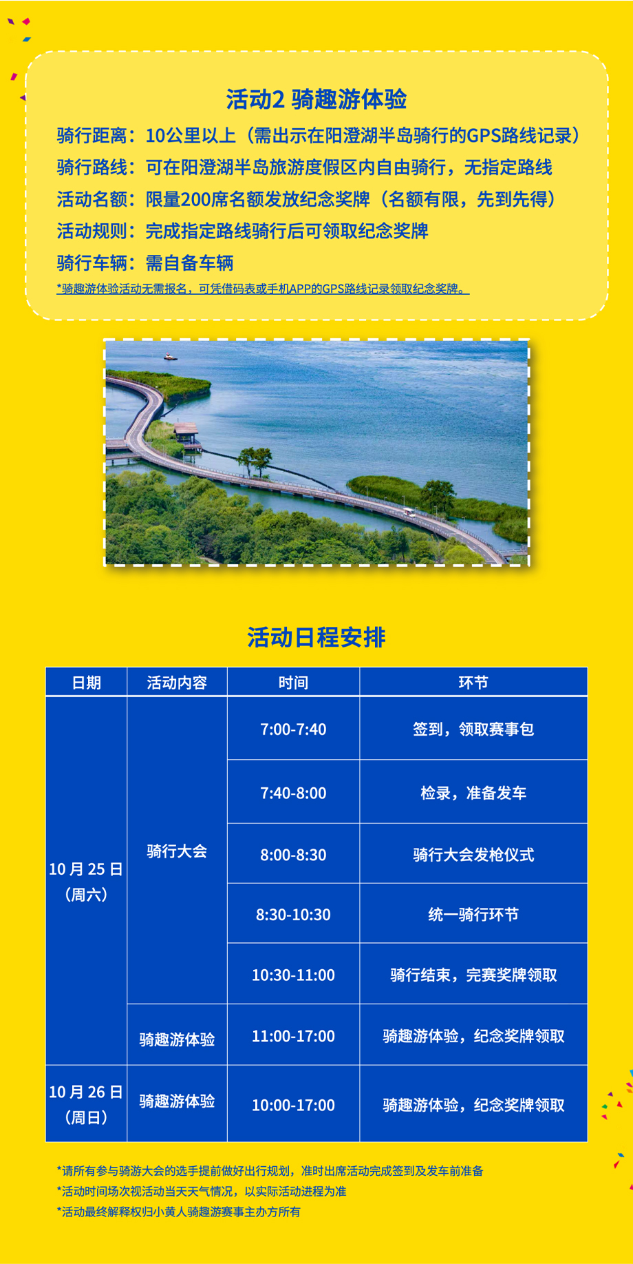 此次活動分為騎行大會、騎趣游體驗兩種形式,騎行大會需自備車輛、按照指定路線騎行,騎行距離約為10公里,參與者需年滿16周歲,完成指定路線騎行后可領取完賽獎牌,報名費用為28.8元;騎趣游體驗也需自備車輛,可在陽澄湖半島旅游度假區內自由騎行,騎行距離為10公里以上(需出示在陽澄湖半島騎行的GPS路線記錄),完成騎行后可獲得紀念獎牌(限量200席名額),該項活動無需報名,可憑借碼表或手機APP的GPS路線記錄領取紀念獎牌。