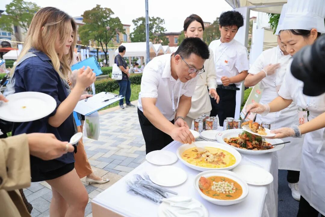 在河岸的展示區,選手們提前準備的“蟹味美學”展示菜,被精心擺放在錯落有致的展臺上。各式色香味俱全的菜品吸引了眾多市民游客紛紛駐足觀賞品鑒。