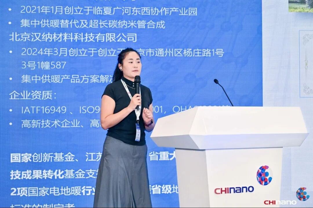 蘇州漢納材料科技有限公司銷售總監朱晶晶,分享了《碳納米管及硅碳負極的研發及應用進展》。該公司依托自主研發的超長碳納米管合成、無損分散及精密成膜技術,實現電熱轉換率高達99.19%的納米發熱膜,遠紅外轉換率超85%,顯著提升能效與舒適度。同時,漢納材料在硅碳負極方向開發出10nm級納米硅合成技術,為動力電池提供高性能負極方案;并在單壁碳納米管的量產方向取得顯著突破。企業憑借60余項專利及多地產學研合作,持續拓展碳材料在新能源、健康建筑等領域的應用邊界。