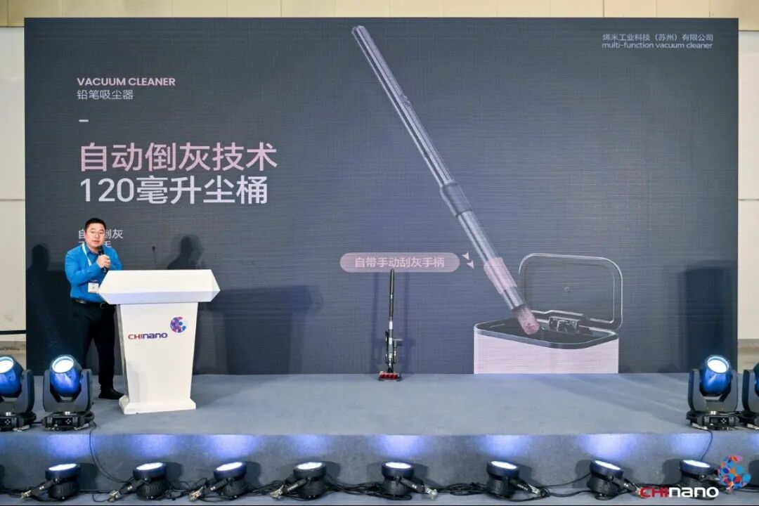 烯米工業科技(蘇州)有限公司研發總監耿軍政,介紹了《基于碳納米材料開發的鉛筆吸塵器發布介紹》。烯米工業擁有全球唯一的自有核心技術,其產品采用在高分子材料領域占據不可替代金字塔頂端地位的聚酰亞胺作為基材。基于此復合材料做基材添加,做出高強度、高模量的高性能的碳纖維材料并在此材料基礎上開發出靈巧輕便、纖細如筆式的新一代清潔家電。此外,該公司利用此復合材料制造出的核心原料——高品質石墨烯粉體,制造出齒輪箱專用潤滑油,專為應對齒輪在超高轉速工況而設計的高性能潤滑解決方案。將此專用潤滑油用在其新一代清潔家電上,攻克了在密閉環境中高轉速電機和齒輪箱的散熱問題。