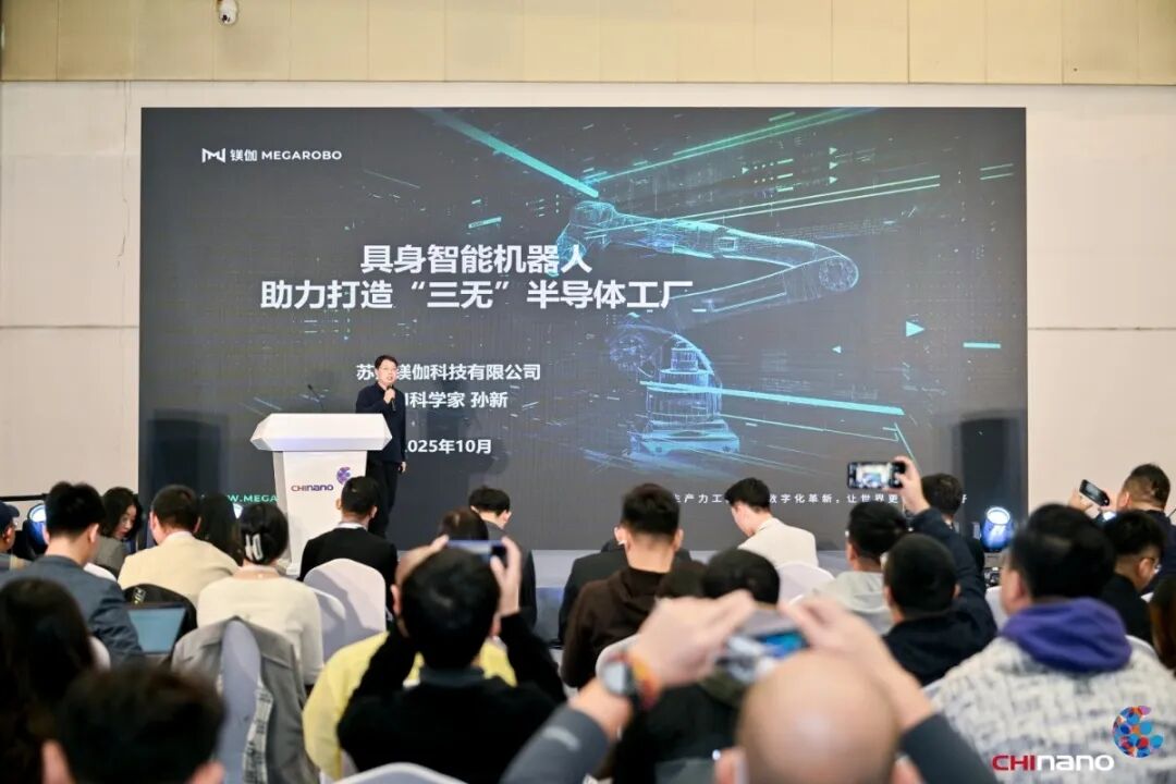 鎂伽科技AI科學家孫新聚焦半導體行業智能化升級,提出以具身智能機器人打造“三無”工廠,解決晶圓廠上下料、物料搬運等環節的自動化難題,實現亞毫米級高精度、高安全性作業,提升生產效率與良率。