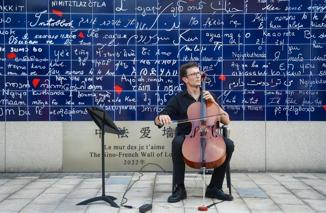 圖說(shuō):藝術(shù)家在中法愛(ài)墻前表演(蘇州工業(yè)園區(qū)供圖)