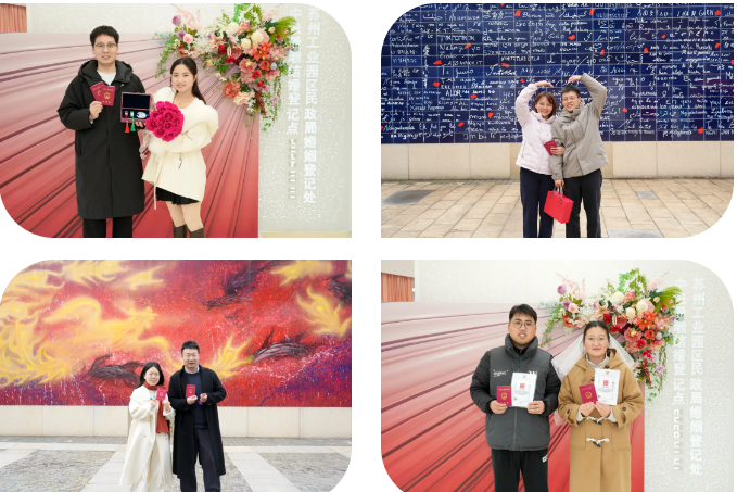 現場洋溢著幸福與儀式感,下午1點活動開始后,前10對完成婚姻登記的新人如約獲贈數字篆刻專屬印章印章由“印記園區印向未來”蘇州工業園區大眾篆刻作品展特別定制,將新人姓名以傳統篆刻藝術數字化呈現,可永久保存、隨時調用。一枚印章,既是愛情的信物,也是新年最獨特的紀念。