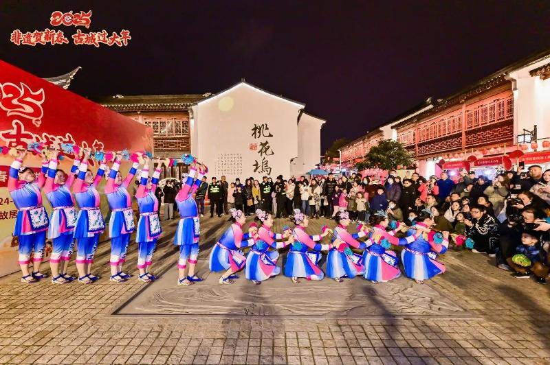 在桃花塢古色古香的背景映襯下,來自園區勝浦街道的“浦韻非凡連廂隊”隊員們也為市民游客奉獻了一場精彩絕倫的打連廂表演《圓融》。