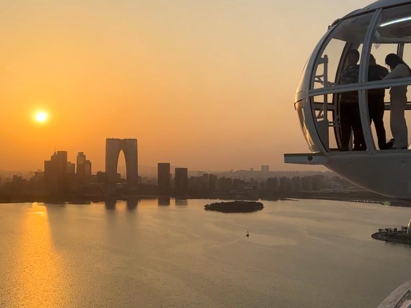 日落時(shí)分,不少市民游客前來體驗(yàn),太空艙內(nèi),洋溢著歡聲笑語。孩子們興奮地貼在窗邊,好奇地打量著逐漸變小的地面,父母向他們輕聲講述著窗外的風(fēng)景。情侶們緊緊相依,抓住每個(gè)瞬間,用相機(jī)定格甜蜜。隨著摩天輪緩緩上升,金雞湖的春日美景如畫卷般在眼前徐徐鋪展,夕陽將湖面染成金黃,波光粼粼。當(dāng)艙內(nèi)廣播提示摩天輪即將到達(dá)最高點(diǎn),大家緊張又興奮,紛紛站了起來。極目遠(yuǎn)眺,湖中央桃花島綠意蔥蘢,宛如世外桃源;金雞湖06驛站靜靜矗立,見證著人來人往的繁華;東方之門作為蘇州的城市地標(biāo),以其獨(dú)特的造型在高樓間格外醒目,盡顯現(xiàn)代都市魅力。多種景致交織,將歷史古韻與現(xiàn)代都市風(fēng)情完美融合,園區(qū)的韻味展露無遺。