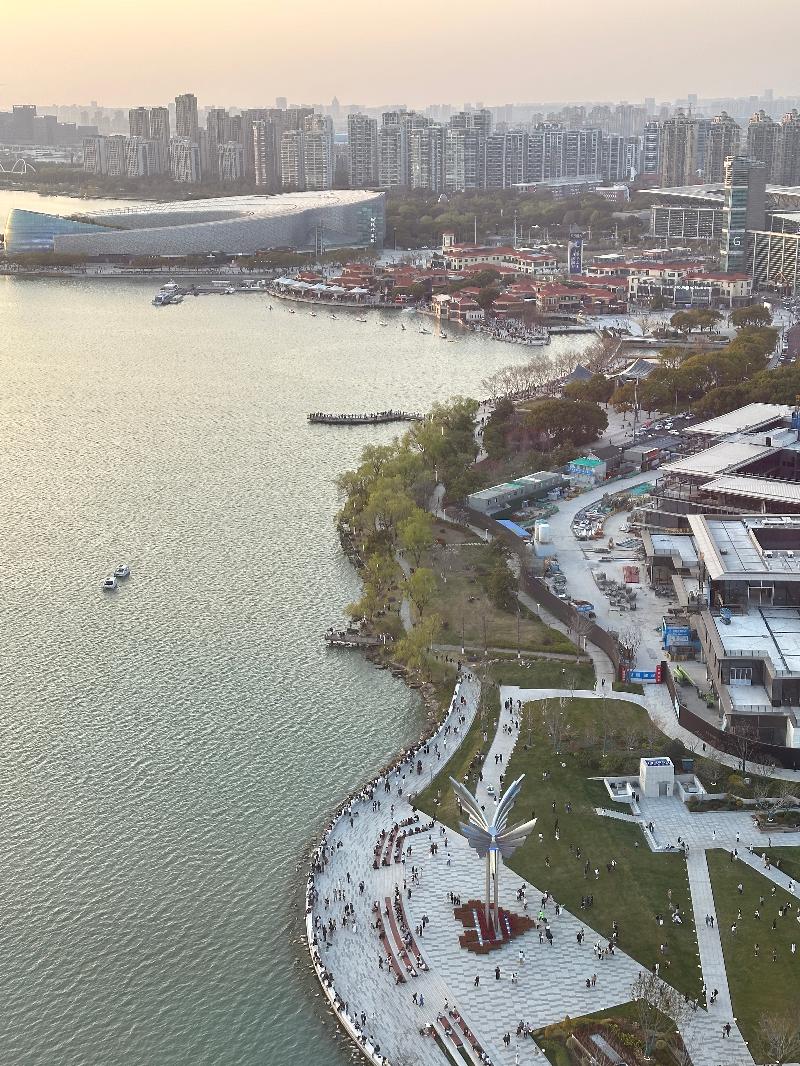 從摩天輪上俯瞰,飛翔雕塑下,春日游湖人潮洶涌,街道上車水馬龍,城市的蓬勃生命力撲面而來;金雞湖平靜如鏡,湖面上帆船、游船往來穿梭,豐富的水上運(yùn)動(dòng)與晚霞、城市天際線相映成趣,構(gòu)成了一幅悠然的畫面。