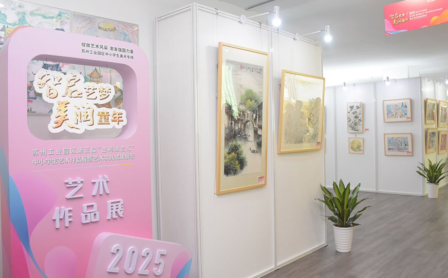 當天,2025蘇州工業園區第三屆“金雞湖之匯”中小學生藝術作品展暨藝術實踐成果展同時揭幕。展覽以“智啟藝夢美潤童年”為主題,通過學生藝術作品、學生現場藝術創作、學校藝術實踐成果3大展區,全面展示了園區“傳統筑基、科技賦能、跨界融合”的向時代美育特色。