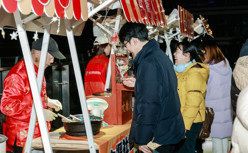 非遺美食區(qū)的煙火氣,妥妥拿捏了年輕人的味蕾。糖畫、冰糖葫蘆、海棠糕、吹糖人、赤豆小圓子五大傳統(tǒng)美食現(xiàn)場制作,香氣直撲鼻腔,吸引大批青年排隊兌換。糖畫攤主手持糖漿壺,手腕輕轉間,龍、鳳、小兔子等可愛造型躍然板上,年輕人圍在一旁舉著手機拍攝,拿到專屬糖畫立刻打卡分享;冰糖葫蘆攤位前,晶瑩糖衣裹著新鮮山楂,酸甜口感瞬間喚醒童年記憶,成為青年們的懷舊必選;海棠糕、赤豆小圓子香味撲鼻,驅散了夜晚涼意,暖心又暖胃。這些美食不僅滿足味蕾,更讓年輕人在品嘗中解鎖傳統(tǒng)風味的新潮打開方式,感受民俗文化的溫度。