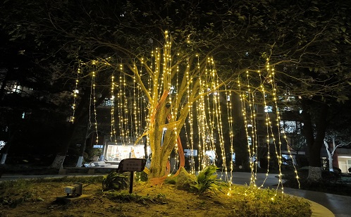 走進湖畔花園小區,節日的氣息撲面而來。主干道兩側,一串串紅燈籠高高掛起,綠植樹木上暖黃色的燈串纏繞閃爍,勾勒出溫馨的夜景輪廓。社區小游園中央景觀帶里的大樹上垂掛著上百條細軟的燈帶,夜幕下宛若一場凝固的金色流星雨,遠遠望去,圓形花壇仿佛一座靜謐而夢幻的光之島嶼。每幢樓的入戶門前也掛起了喜慶的大紅燈籠,喜氣洋洋地迎接著每一位歸家的居民。小區各個區域的亮化工程設計都經過了一番精心構思,講究造型格調的同時還特別注重節能環保。居民張女士帶著孩子在小游園玩耍:“今年我們小區布置得特別漂亮,晚上在小區散步,這些裝飾燈很有氛圍感!”