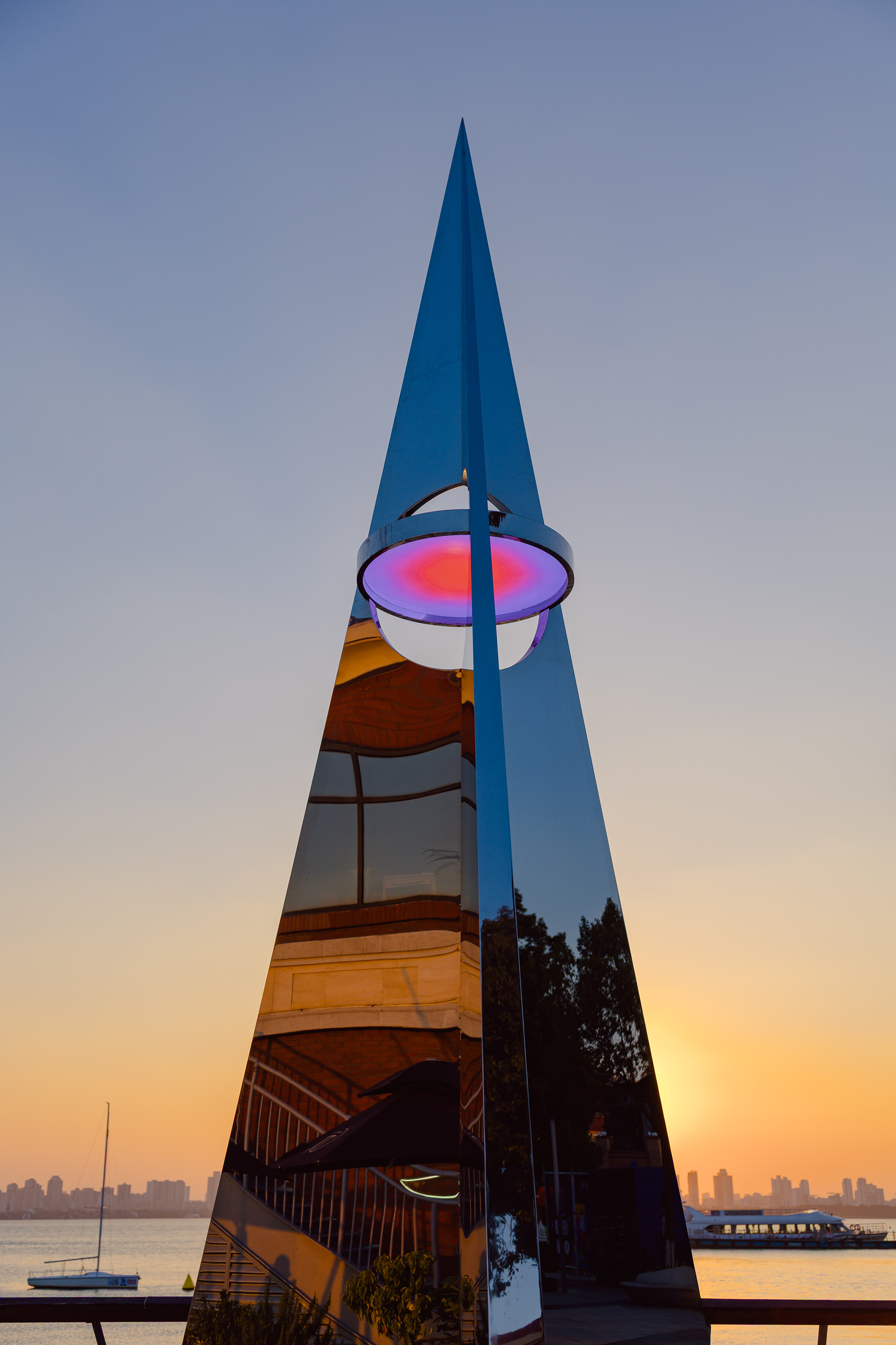 《問境》以紙飛機(jī)為靈感、以火箭升空姿態(tài)為造型,主體采用純鏡面不銹鋼材質(zhì),曾先后在深圳、杭州、上海等城市巡展,擁有極高的藝術(shù)口碑。裝置隨天光流轉(zhuǎn)與季節(jié)更迭,倒映出金雞湖的粼粼波影、澄澈天空與城市輪廓,營(yíng)造出錯(cuò)位的空間感。其設(shè)計(jì)暗藏巧思,裝置中心3.84米高處懸掛的圓形天境燈,象征著地月之距,可依自然光譜智能調(diào)光,燈光經(jīng)鏡面折射后,與湖畔夜景交融成一幅靈動(dòng)畫卷;無論從何種角度仰望,鏡中皆能望見“完整月亮”,寓意著在萬象紛繁中窺見內(nèi)在的完整與純粹。每一次駐足都能捕捉到獨(dú)一無二的光影畫面,隨手一拍皆是自帶濾鏡的大片。