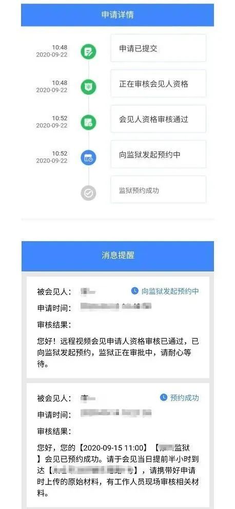 向監獄預約成功后,工作人員會將會見時間、地點及相關要求通過消息提醒和手機短信發送給家屬,請注意查收。