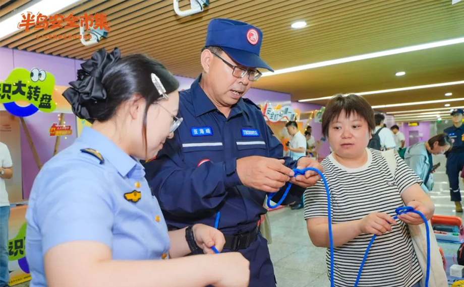 市集現場不僅發放了安全手冊,還設置了“電磁迷宮”,需要體驗人舉起鐵環無觸碰完成穿越,否則將感受到“觸電”體驗,引導大家注意用電安全;現場講解的海姆立克急救法實操、心肺復蘇術的操作步驟及方法吸引了現場市民一起參與體驗,讓更多人掌握了急救方法;被總結為“圍、系、拉、抽”簡要口訣的逃生繩“救命繩結”使用教學,帶領大小朋友們一起學習打逃生結。