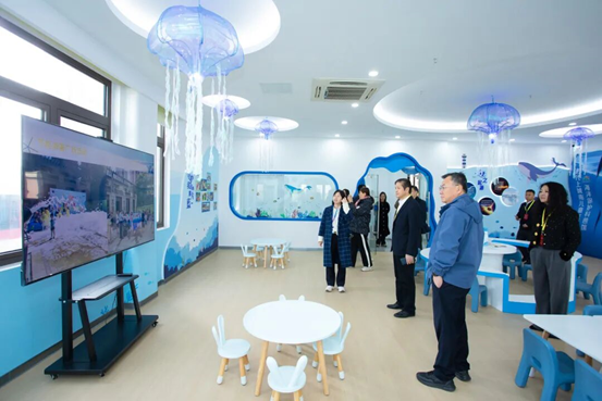 調研組首先來到時代上城南社區聽取兒童友好社區工作情況匯報。時代上城南社區通過打造“時上少兒成長站”兒童參與式的友好服務陣地,圍繞“童育、童護、童益、童樂、童享”五大主題開展特色活動,護航未成年人全面發展。在參觀“時代上城南兒童友好海洋保護科普館”時,調研組對街道圍繞兒童實際需求,開展系列服務活動表示充分肯定,指出相關舉措有效優化了兒童成長環境,切實保障兒童權益,體現了街道在社區治理中的溫度與創新。
