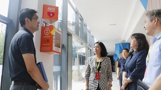調(diào)研組一行首先前往玲瓏灣社區(qū),實(shí)地考察社區(qū)內(nèi)AED的安裝位置、設(shè)備維護(hù)及公眾可及性等情況。隨后,走進(jìn)西安交通大學(xué)蘇州附屬初級中學(xué),深入了解了校園內(nèi)AED的配置數(shù)量、標(biāo)識指引以及師生培訓(xùn)情況。